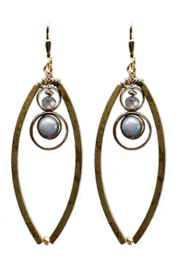 Modern brass hoops and rings with pale blue/gray angelite and labradorite on 22K vermeil lever back earring fixtures.