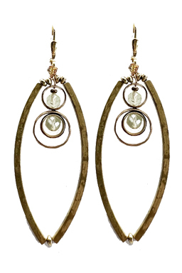 Modern brass hoops and rings with pale jade colored prehnite beads on 22K vermeil lever back earring fixtures.