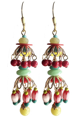 Super festive signature Joli® long, dangly multi-colored mix of olive jade beads with assorted vintage glass and plastic accent dangles and assorted seed beads accents with brass findings on 22K vermeil leverback earring fixtures.