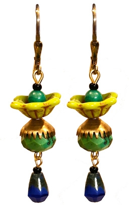 Festive everyday earring made with amazonite, Chinese turquoise and new glass beads in chartreuse and kobalt blue with new brass findings on 22K vermeil lever back earring fixtures. 1.75"L x .5"W