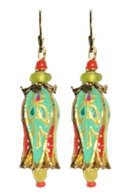 Handpainted Fabrege Egg inspired tulip drop earring with vintage and semi-precious accent beads on 22K vermeil leverback earring fixtures. 2"L x .5"W