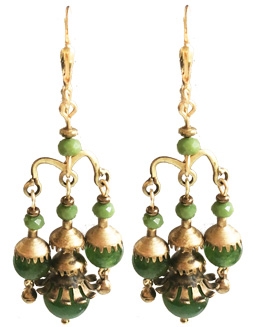 Best selling shape with Peking jade and brass chandelier-like drops with glass bead accents on 22K vermeil leverback earring fixtures. 1.5"L x .66"W