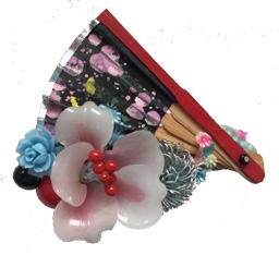 Vintage handpainted wooden fan with vintage glass celllulid, glass and string flowers on 3.5" french barrette fixture. 3.75"L x 3.25"W