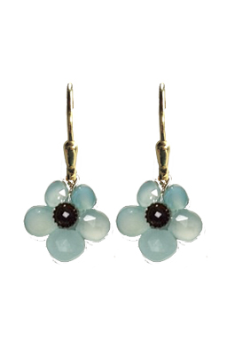 Faceted aqua chalcedony doublets make up this floral arrangement with amethyst centers and brass findings on 22K vermeil lever back earring fixtures.