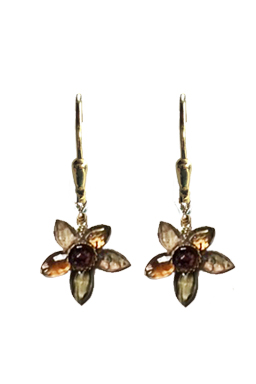 Faceted hydroquartz doublets make up this floral arrangement with garnet centers and brass findings on 22K vermeil lever back earring fixtures.