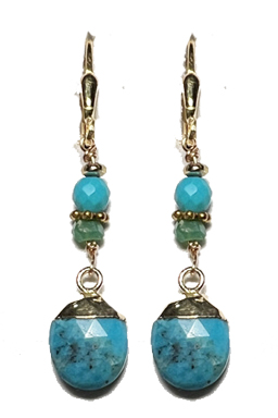 Delicate faceted teal apetite drops & rondelles with vermeil caps and leverback earring fixtures. 1"L x .3"W