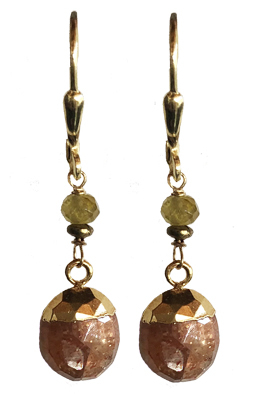 Delicate faceted sunstone drops partially encased in vermeil with brass and green garnet rondelles on leverback earring fixtures. 1"L x .3"W