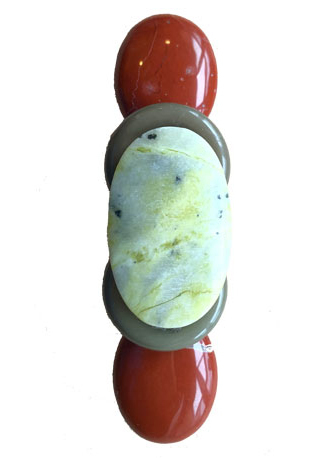 Red jasper sides with natural pale olive and jade oval stone center with '60's vintage plastic sides on French barrette fixture. 4.5" x 1.25"W