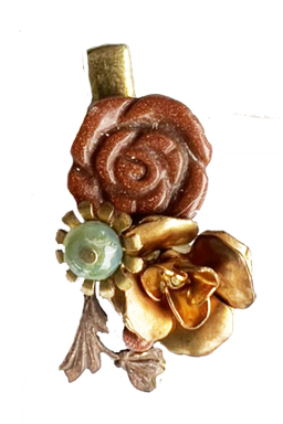 Sturdy antiqued brass alligator clip that tightly holds a swath of hair well-with an array of sparkly carved goldstone with jade colored crystal bead and vintage brass findings.
