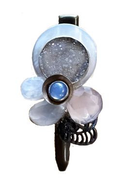 Sturdy antiqued brass alligator clip that tightly holds a swath of hair well-with an array of pale pink and cloudy crystal chalcedony and druzy gemstones with mother of pearl and vintage brass findings.