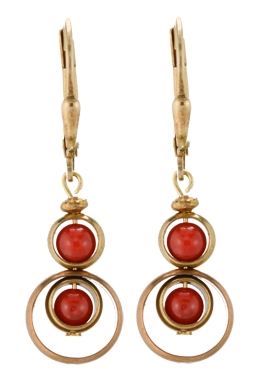 Spinning brass rings encircling genuine coral beads on 22K vermeil lever back earring fixtures. .75"L x .25"W