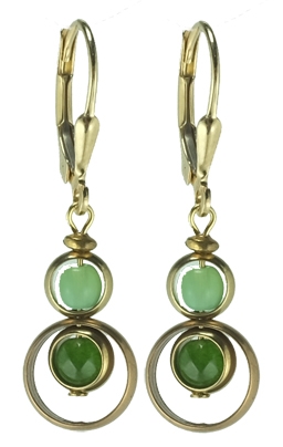 Spinning brass rings encircling milky green glass & faceted Korean jade beads on 22K vermeil lever back earring fixtures. .75"L x .25"W