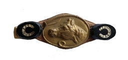 Vintage brass horse stamping with 1920's jet/crystal horseshoe stones on antiqued bronze toothed hair clip to pin up a bit of hair. 1.75" L x .5" W