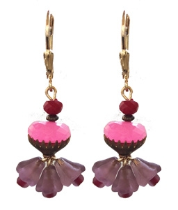 Hot pink new jade with vintage glass frosted amethyst bells on 22K vermeil lever back fixtures. 1.5"L x .5" W