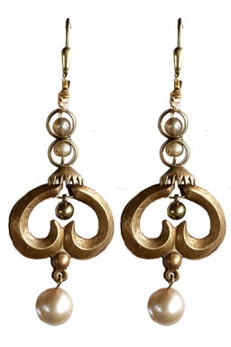 Casually elegant mix of brass findings and freshwater champagne colored pearl beads on 22K vermeil lever back earring fixtures for secure wearing.