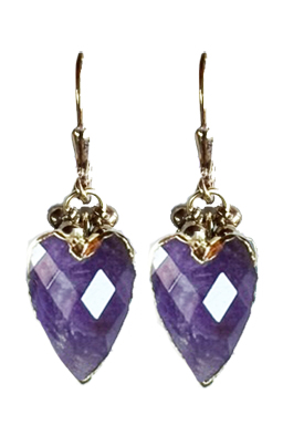 Faceted amethyst hearts surrounded by vermeil with brass ball accents on 22K vermeil lever back earring fixtures.