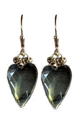 Faceted irridescent labradorite hearts surrounded by vermeil with brass ball accents on 22K vermeil lever back earring fixtures.