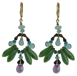 Classic American Indian deco style made from milky turquoise "feathers" with faceted teal color apatite, aquamarine and pyrite stones with crystal accents on 22K vermeil leverback earring fixtures. 1 3/4" L x 1 1/2" W