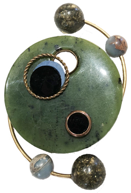 Mod design made with African jade base, 1920's jet glass accents with 1960's black plastic gold flecked and jasper beads with 1960's brass hoops.