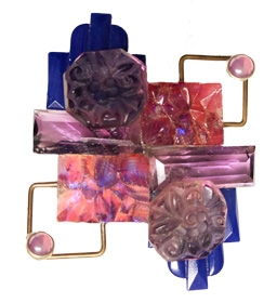 All vintage components make this dimensional pin: 1920's-'40's deco glass with '60's brass findings. 2.5"L x 2.5"W