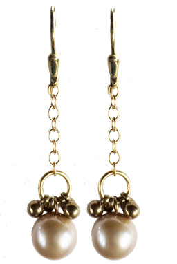 Champagne colored freshwater pearls surrounded by brass dangles dropped off a vermeil chain with 22K vermeil lever back earring fixtures. 1.75"L x .3"W