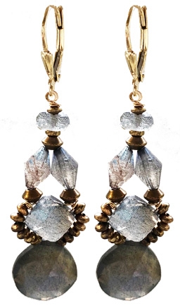 Lovely irridescent labradorite stones create this dressy deco style earring with brass accents on 22K vermeil lever back earring fixtures. 2"L x .5"W