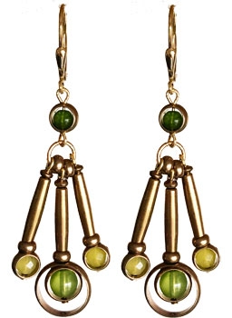 Mod, classic style made with brass with glass and new jade beads on 22K vermeil lever back earrings. 2.5"L x .5"W