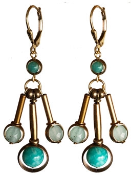 Mod, classic style made with brass and dyed pale aqua new jade and amazonite beads on 22K vermeil lever back earrings. 2.5"L x .5"W