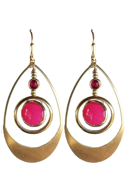 Bold and large brass hoop earring with faceted hot pink chalcedony and fucia agate dangle on 22K vermeil lever back earring fixtures.