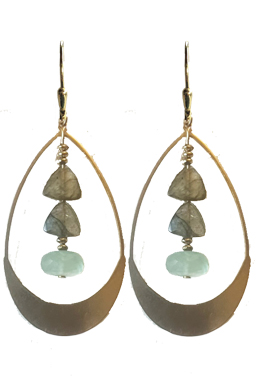 Bold and large brass hoop earring with faceted labratdorite and amazonite dangle on 22K vermeil lever back earring fixtures.
