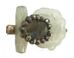 New jade carving base with faceted labradorite and pyrite top accents on antiqued bronze toothed hair clip for a more subtle touch to pin up a bit of hair. 1.75" L x 1" W