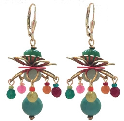 Fun, lotus-inspired dangly earrings made with vintage glass & plastic with new jade, olive jade, aventurine and green onyx accents on 22K vermeil leverback earring fixtures. 2"L x 1.5"W