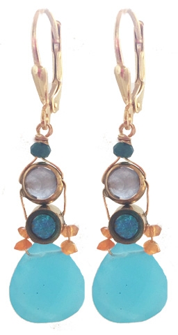 Modern, delicate medium sized drop earrings with faceted chalcedony gemstones, carnelian and dyed pale blue faceted accents with vintage turquoise rhinestones encased in brass on 22K vermeil lever back earrings fixtures. 1.5"L x .5"W