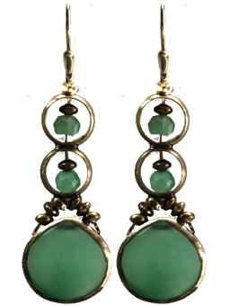 Faceted vermeil framed chryscolla drops with brass rings surrounding faceted pyrite beads on 22K vermeil lever back earring fixtures. 1.25" L x .6" W
