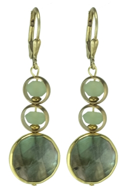 Faceted vermeil framed labradorite drops with brass rings surrounding Afghan jade beads on 22K vermeil lever back earring fixtures. 1.75" L x .5" W