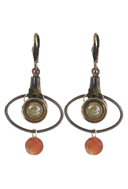 Vintage brass oval hoop base with carnelian and '50's pale yellow glass accents on 22K vermeil lever back earring fixtures.