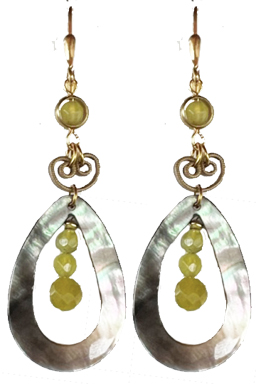 Mother of pearl teardrop hoop with faceted olive jade drops with vintage and new brass findings on 22K vermeil lever back earring fixtures.