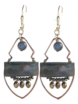 Morrocan inspired earrings made with faceted labradorite rectangles with dyed new jade accent and vintage brass base on 22K vermeil leverback earring backs.