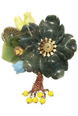 Large carved moss agate flower with 1950's-'60's vintage glass and metal tassel, African jade flower, new jade and '50's enamel accents.