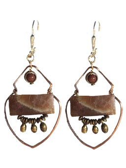 Morrocan inspired earrings made with faceted sunstone rectangles with goldstone accents and vintage brass base on 22K vermeil leverback earring backs.