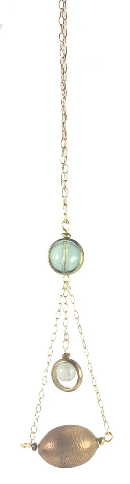 Long, light weight deco necklace on light gold-fill chain with vintage brass and flourite beads with brass findings. 24"L + 2" extender + 2" pendant