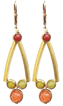 Deco, elegant earring with faceted orange dyed new jade with olive jade and carnelian accents with brass on 22K vermeil lever back earring fixtures. 2"L x .75"W