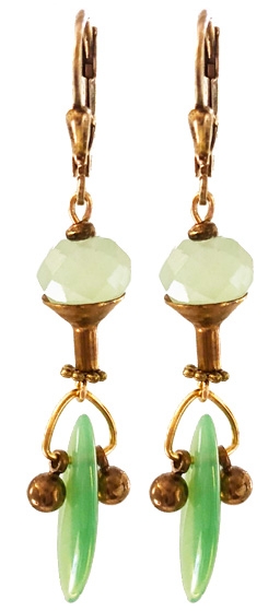 Mod design with new glass and vintage brass findings on 22K vermeil lever back earring fixtures. 1.5"L x .25"W