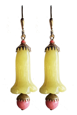 Carved olive jade tulips with dyed stone coral accents and brass findings on 22K vermeil lever back earring fixtures.