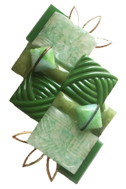 Deco glass (1920's-40's) with brass stampings make this geometric collage brooche. 3.25"L x 2.5"W