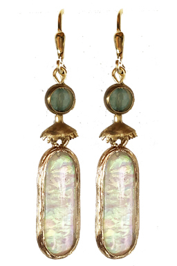 Opal looking lightweight glass stones in bezel setting accented by brass findings and faceted blue new jade tops on 22K vermeil lever back earring fixtures.