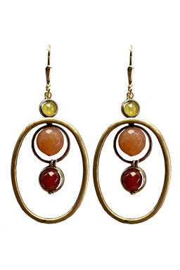 Mod design of oval and round brass rings with faceted gemstones: olive jade, carnelian and fuscia agate on 22K vermeil lever back earring fixtures.