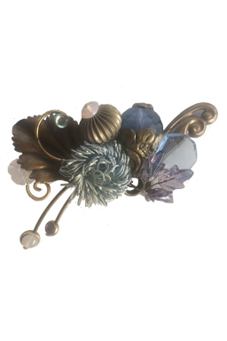 Limited edition, organic mix of faceted Tibetan opalite, vintage brass findings and glass accents with rose quartz with vintage textile flower.