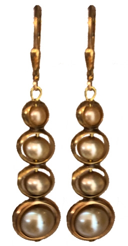 Champagne colored freshwater 'pearl bubbles' in brass rings on 22K vermeil lever back earring fixtures. 1.5"L .25"W