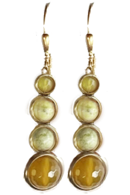 Brown jade with olive jade and yellow turquoise bead 'pearl bubbles' in brass rings on 22K vermeil lever back earring fixtures. 1.5"L x .25"W